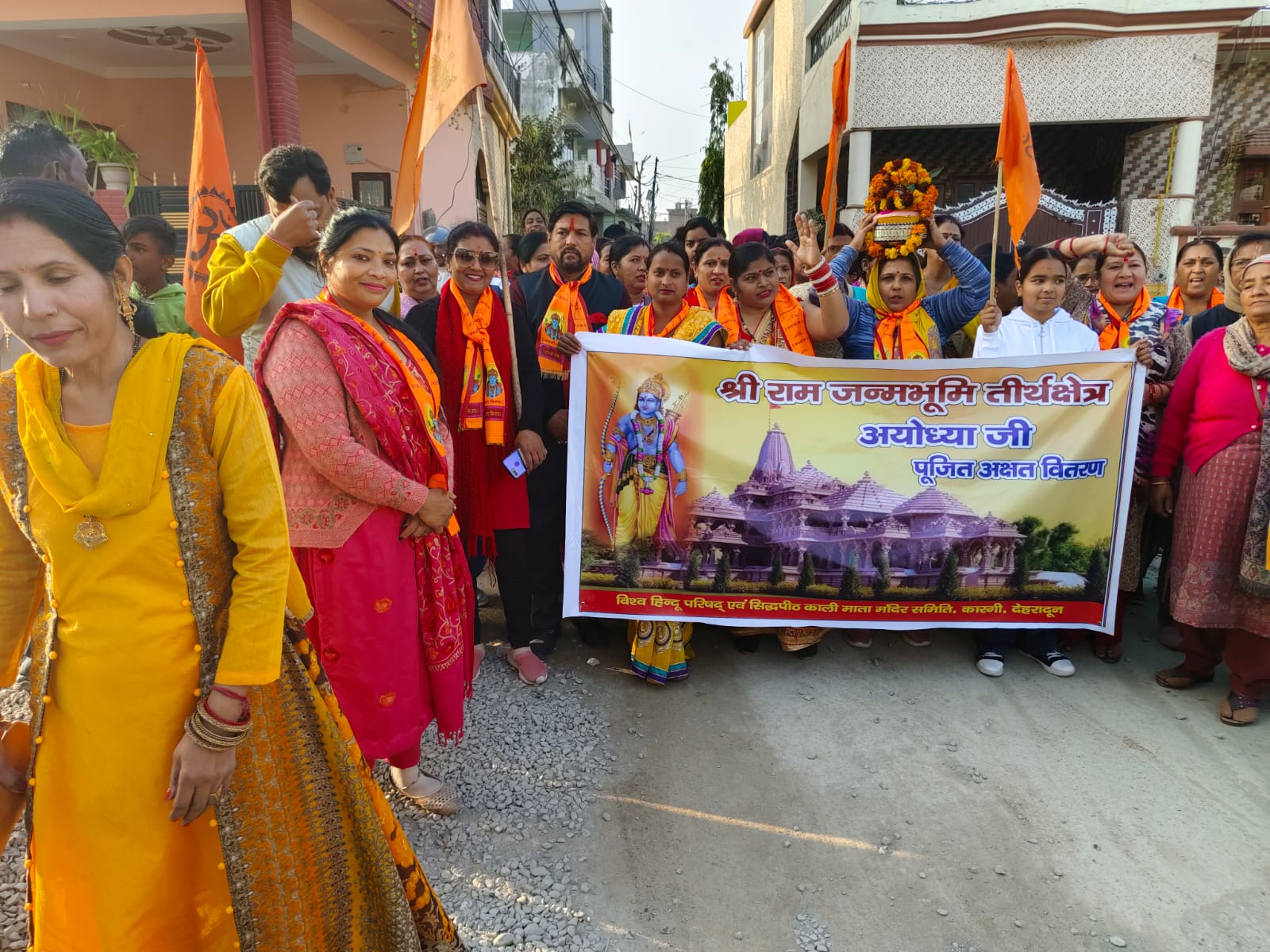 देहरादून। विश्व हिंदू परिषद एवं सिद्धपीठ प्राचीन काली माता मंदिर समिति द्वारा विशाल कलश यात्रा मंगलवार को निकाली गई। इस दौरान अयोध्या से आए पूजित अक्षत कारगी क्षेत्र में घर-घर बांटे गए, जिससे पूरा क्षेत्र राममय हो गया।