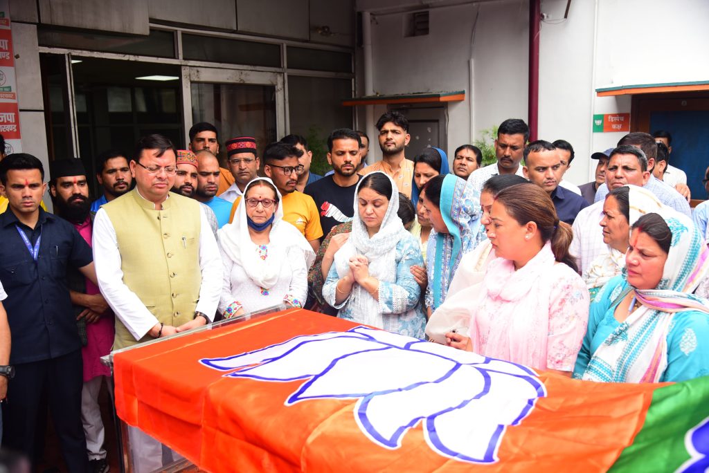 देहरादून। बुधवार को मुख्यमंत्री पुष्कर सिंह धामी ने बलबीर रोड स्थित भाजपा कार्यालय में केदारनाथ विधानसभा क्षेत्र की विधायक शैलारानी रावत के पार्थिव शरीर पर पुष्पचक्र अर्पित कर भावभीनी श्रद्धांजलि दी।