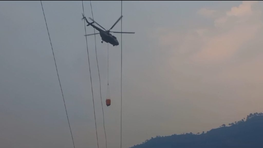 बात पौड़ी गढ़वाल की अगर करें तो इस जिले की विकराल हो गई जंगलों की आग को काबू करने के लिए राज्य सरकार वायुसेना की मदद ले रही है। यहां पर पहली बार सोमवार को दोपहर बाद एयर फोर्स का हेलीकॉप्टर श्रीनगर के समीप कोटेश्वर हेलीपैड पर उतरा और अलकनंदा झील से बांबी बकेट में पानी भरकर डोभ श्रीकोट में आग बुझाने का कार्य किया। पहले दिन दो राउंड में लगभग पांच हजार लीटर पानी का छिड़काव किया।