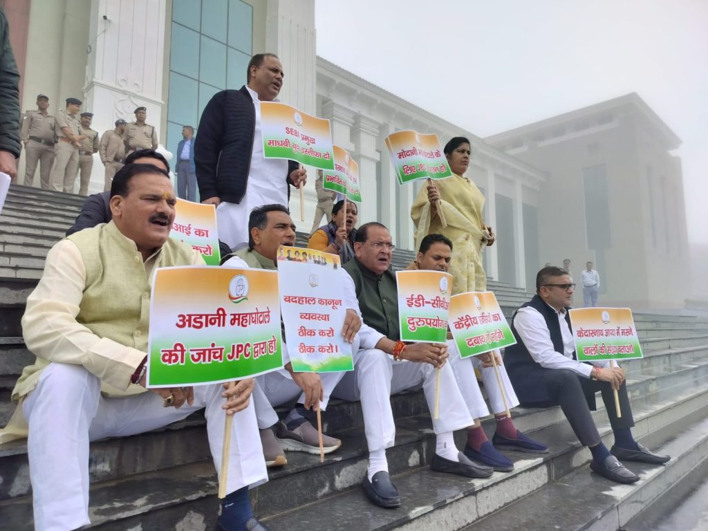 कांग्रेस के विधायकों ने विधानसभा के बाहर सीढ़ियों पर बैठकर केंद्रीय जांच एजेंसियों के कथित दुरुपयोग को लेकर किया प्रदर्शन